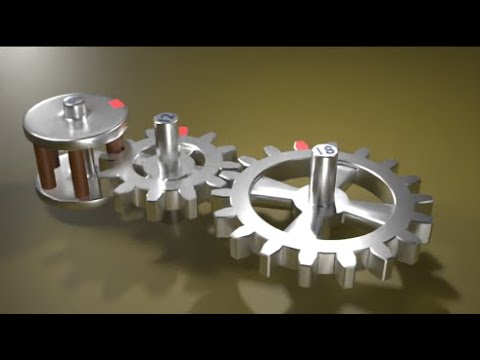 I often use gears in my Blender models. This demo animation shows the relationship of three gears: one with 18 teeth, a second with 12 teeth and a third bird-cage gear with six bars. This arrangement produces a gear train with a ratio of rotation of three to one.